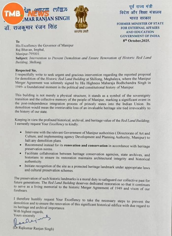 Former Union Minister of State for External Affairs and Education, Dr. Rajkumar Ranjan Singh, has written to the Governor of Manipur seeking urgent intervention to prevent the demolition of the historic Redlands House in Shillong, Meghalaya — the site where the Manipur Merger Agreement of 1949 was signed by Maharaja Bodhachandra Singh.