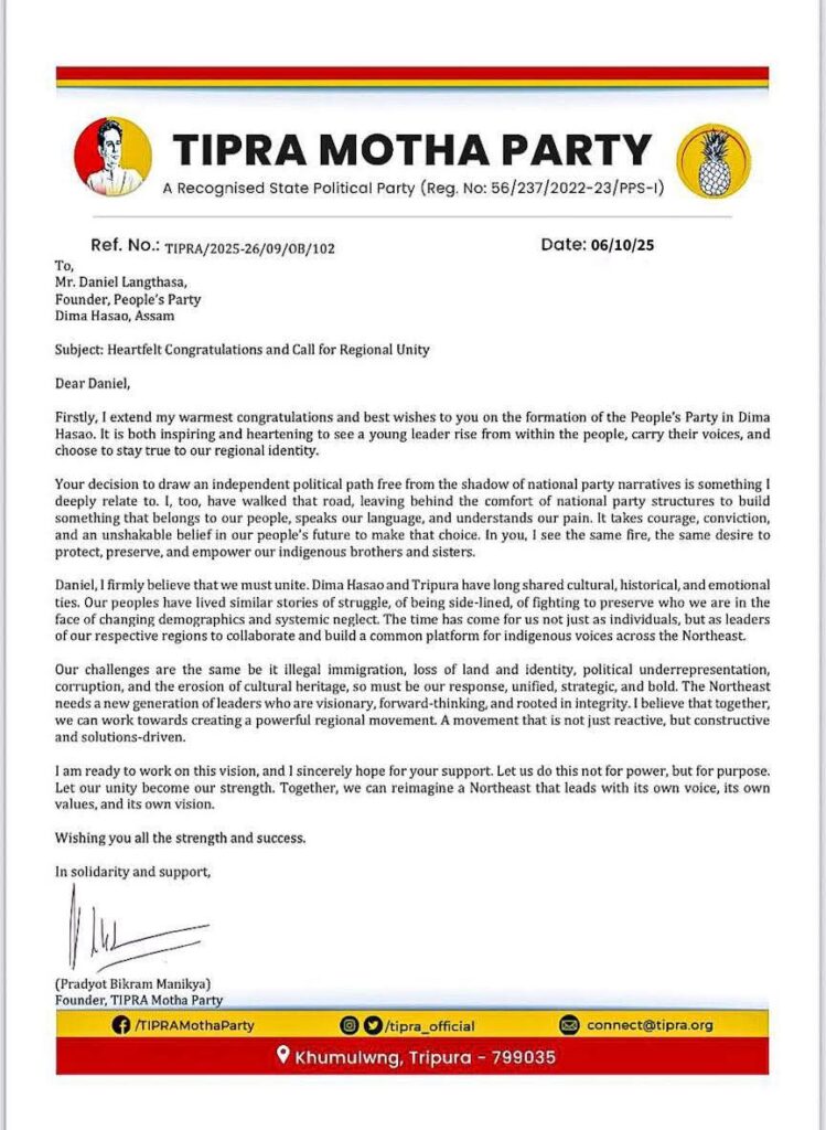 In a letter issued from the party’s headquarters in Khumulwng the previous week, Pradyot described Langthasa’s initiative as a bold and inspiring step that reflects the aspirations of the indigenous people. He praised the young leader’s decision to carve out an independent political identity free from the influence of national party narratives. “It takes courage and conviction to build something that truly belongs to our people, speaks our language, and understands our pain,” the TIPRA Motha chief said.