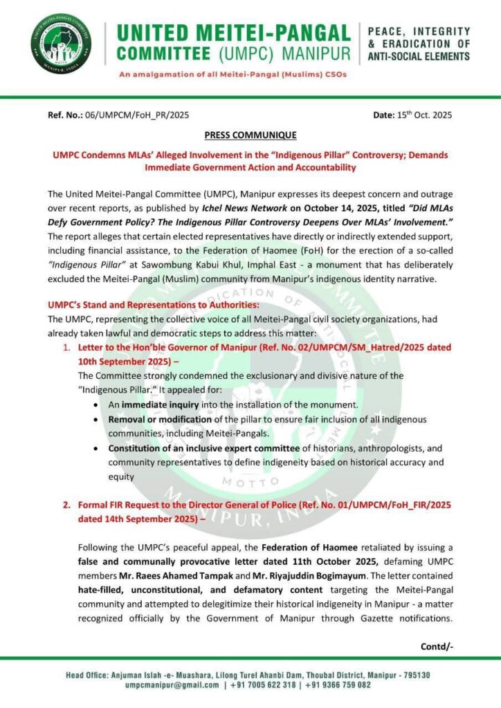 In a press communique dated October 15, 2025, issued by Md Jiaul Haque, Secretary (IPR) of the United Meitei-Pangal Committee, Manipur, the organization expressed its “deepest concern and outrage” over reports published by Ichel News Network on October 14, alleging that certain elected representatives had either directly or indirectly supported or financed the Federation of Haomee (FoH) for the construction of the so-called Indigenous Pillar at Sawombung Kabui Khul in Imphal East. The monument, according to the committee, has deliberately excluded the Meitei-Pangal community from Manipur’s indigenous identity framework.