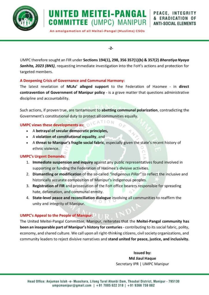 In addition to the letter, the UMPC had lodged a formal First Information Report (FIR) request with the Director General of Police on September 14, 2025, after what it described as defamatory and communally provocative actions by the Federation of Haomee. According to the committee, the FoH retaliated to their peaceful appeal by issuing a “false and communally provocative letter” on October 11, defaming UMPC members Raees Ahamed Tampak and Rivayuddin Bogimayum. “The letter contained hate-filled, unconstitutional, and defamatory content targeting the Meitei-Pangal community and attempted to delegitimize their historical indigeneity in Manipur — a matter recognized officially by the Government of Manipur through Gazette notifications,” the communique stated.